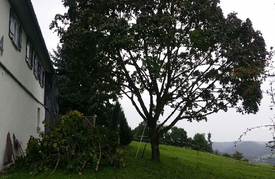 Ahorn ausgelichtet und eingekürzt, so das er nicht mehr an der Hausfasade und Dachrinne scheuert